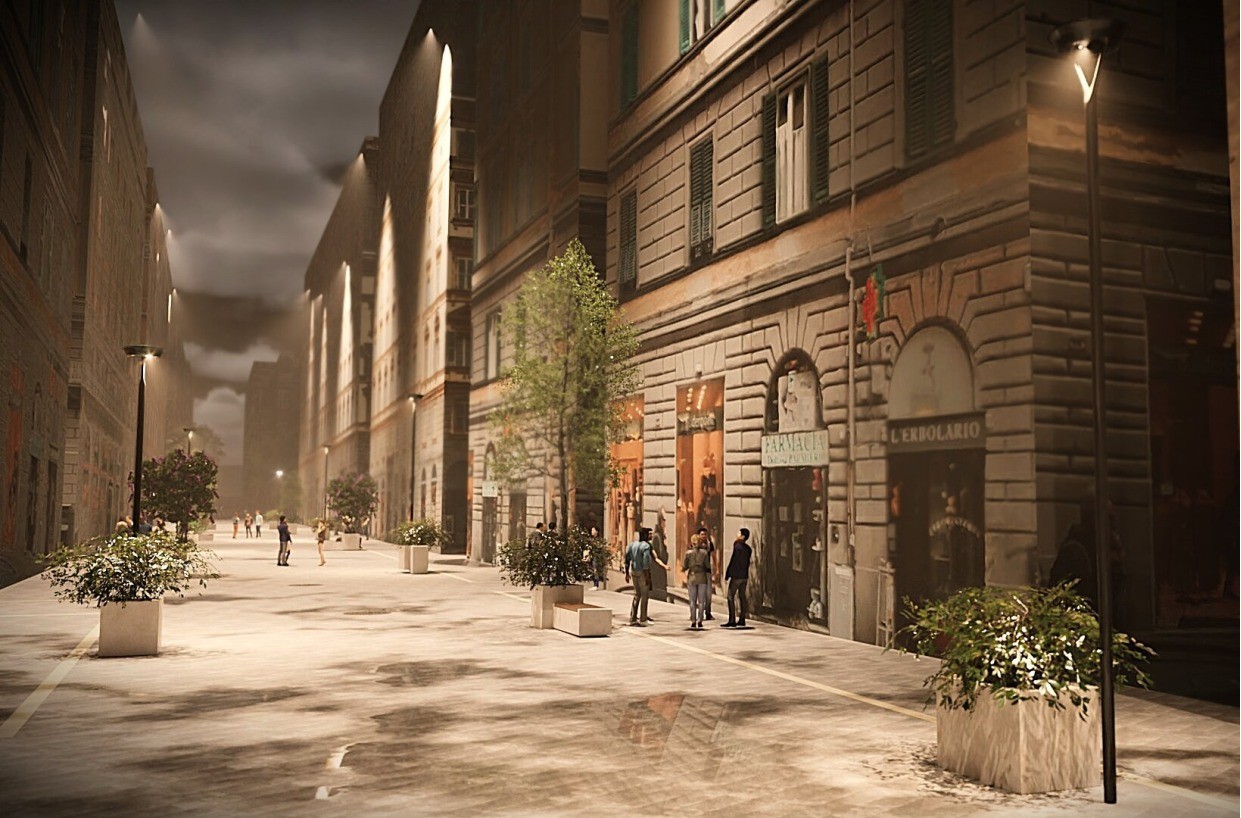 La luce avrà un duplice ruolo: quella proveniente dai pali sarà principalmente funzionale, orientata verso il manto stradale nel rispetto dei livelli illuminotecnici e della sicurezza, mentre le panchine e le fioriere saranno illuminate in modo scenografico. Sotto le sedute delle sarà realizzato un segno di luce blu, simbolo di riconnessione tra la città e il mare, e piccoli spot metteranno in evidenza il verde delle fioriere e le essenze arboree.