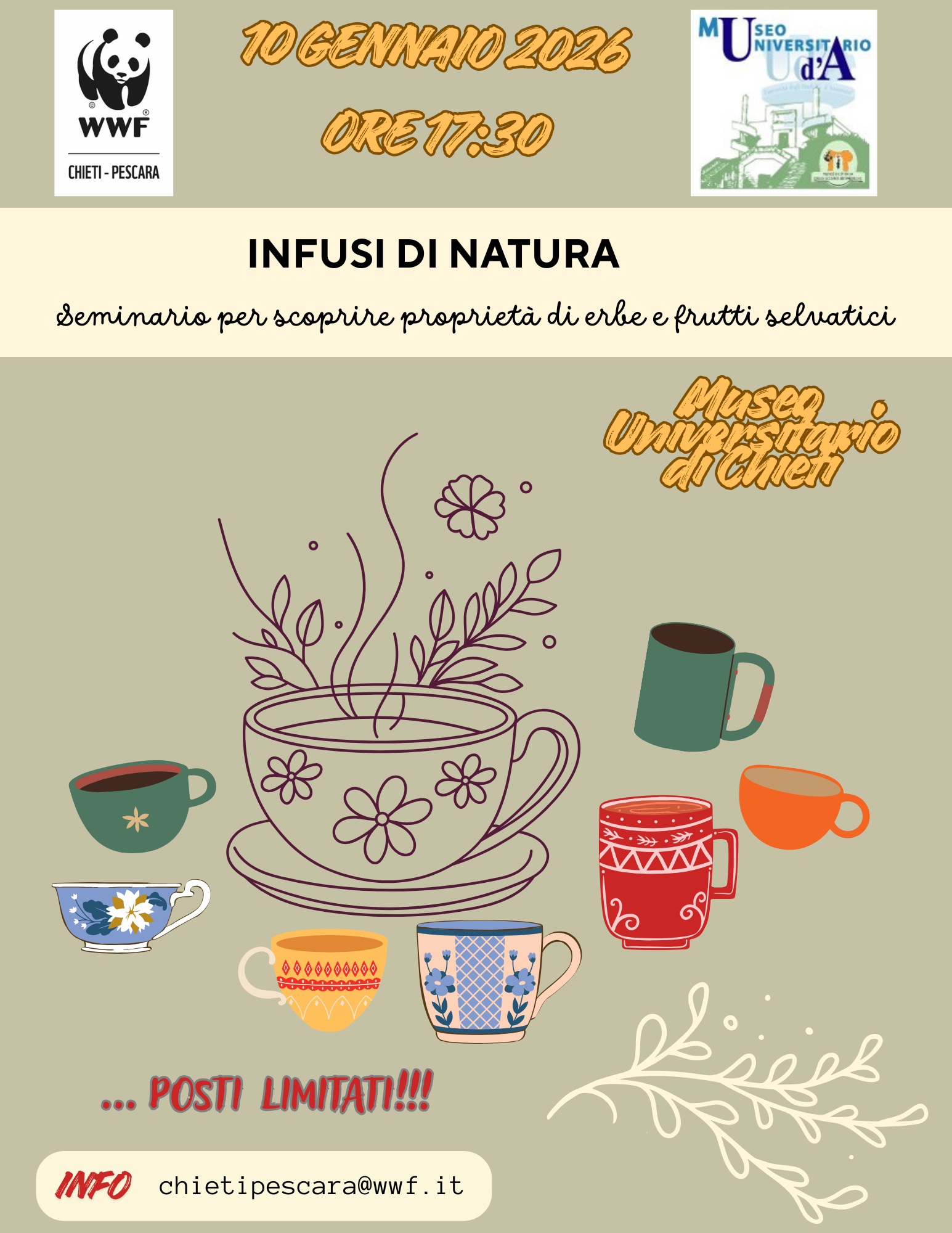 Sabato 10 gennaio alle 17.30, nell’auditorium del Museo universitario di Chieti, si terrà il primo appuntamento 2026 del WWF Chieti-Pescara: “Infusi di Natura – Seminario per scoprire proprietà di erbe e frutti selvatici”. L’incontro vedrà gli interventi di Maria Peroni (Parco Nazionale della Maiella) e di Luciano Schiazza, già Comandante dei Carabinieri Forestali del PNM di Caramanico Terme, che parleranno dell’uso di erbe, bacche e frutti spontanei per tisane e infusi. Saluti iniziali del professor Ruggero D’Anastasio, direttore del Museo, e di Nicoletta Di Francesco, presidente WWF Chieti-Pescara. I posti limitati: prenotazione obbligatoria via email a chietipescara@wwf.it o WhatsApp al 320 2788489.