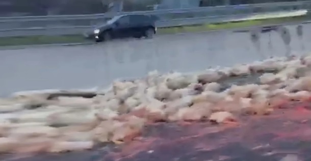 Tutto il carico - pollame destinato verosimilmente ai macelli - si è riversato in strada, anche nella carreggiata opposta, provocando anche paura tra gli automobilisti, frenate improvvise.