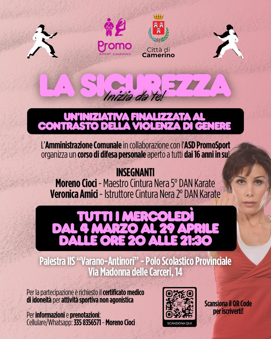 A Camerino prende il via l’iniziativa “La sicurezza inizia da te”, un corso di difesa personale pensato per contrastare la violenza di genere. L’iniziativa, promossa dall’Amministrazione Comunale in collaborazione con Asd PromoSport Camerino, punta offrire strumenti concreti di prevenzione, consapevolezza e autodifesa, unendo alla pratica sportiva anche momenti di sensibilizzazione su un tema di grande attualità e rilevanza sociale L’obiettivo è promuovere una cultura del rispetto, della responsabilità e dell’autotutela, coinvolgendo tutti coloro che hanno almeno 16 anni. «La sicurezza è un diritto fondamentale e deve partire dalla consapevolezza di ciascuno di noi», dichiara il sindaco Roberto Lucarelli. «Con questa iniziativa vogliamo offrire strumenti concreti di prevenzione e allo stesso tempo lanciare un messaggio chiaro: la violenza di genere si combatte anche attraverso educazione, formazione e cultura del rispetto». Il sindaco ringrazia l’ASD PromoSport, l’istruttore Moreno Cioci, ideatore del progetto, e l’istruttrice Veronica Amici per la professionalità e la disponibilità dimostrate verso la comunità. Il corso sarà guidato da: Moreno Cioci, Maestro Cintura Nera 5° Dan di Karate, e Veronica Amici, Istruttrice Cintura Nera 2° Dan di Karate. Le lezioni si terranno tutti i mercoledì, dal 4 marzo al 29 aprile, dalle 20 alle 21.30, presso la palestra dell’IIS “Varano-Antinori”, in Via Madonna delle Carceri 14. Per partecipare è necessario possedere un certificato medico di idoneità per attività sportiva non agonistica. Per informazioni e iscrizioni, è possibile contattare Moreno Cioci al numero 335 8356571.