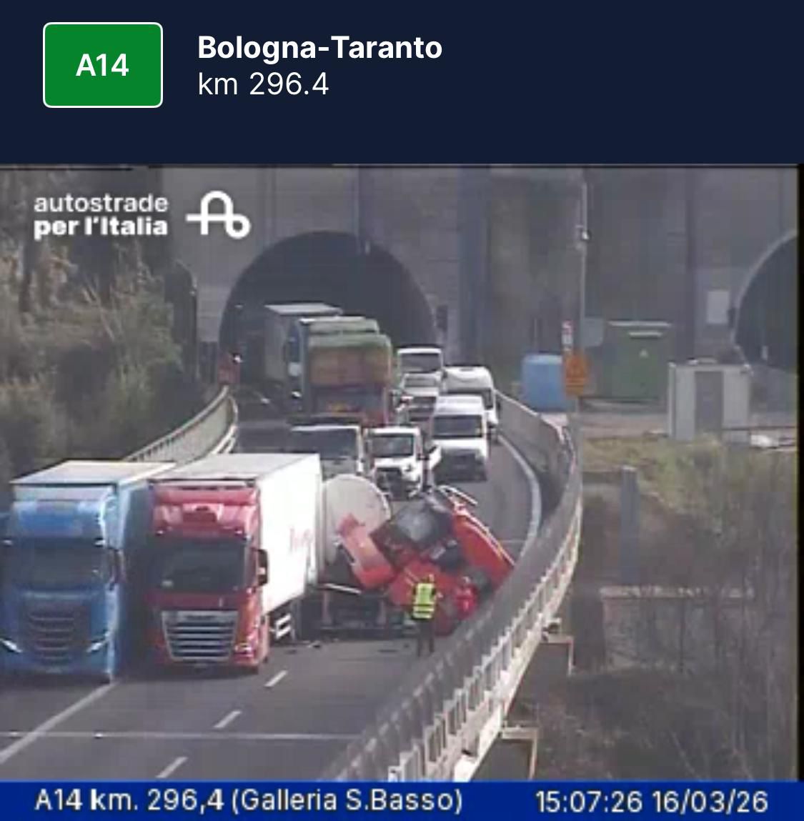 Nuovo incidente sull’autostrada Autostrada A14 Adriatica nel tratto compreso tra Grottammare e Pedaso, dove la carreggiata in direzione nord è stata temporaneamente chiusa al traffico. Lo schianto si è verificato all’uscita della galleria San Basso, nel territorio di Cupra Marittima, in provincia di Ascoli Piceno. Nell’incidente sono rimasti coinvolti tre mezzi pesanti; uno dei camion, a seguito dell’impatto, si è ribaltato sulla carreggiata. Sul posto sono intervenuti i sanitari del Servizio 118, le squadre dei Vigili del Fuoco e il personale di Autostrade per l’Italia, impegnati nelle operazioni di soccorso, nella messa in sicurezza dell’area e nella gestione della viabilità. La chiusura del tratto autostradale sta provocando code chilometriche per i veicoli diretti verso Ancona. Per chi viaggia in direzione nord viene consigliata l’uscita a San Benedetto del Tronto.